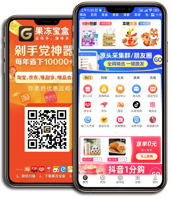 果冻宝盒主要功能:查找优惠省钱,线上线下购物得佣,分享好物、利人利己。APP覆盖淘宝、京东、拼多多、抖音、唯品会、本地生活、旅游、出行、外卖、加油、各类充值等。